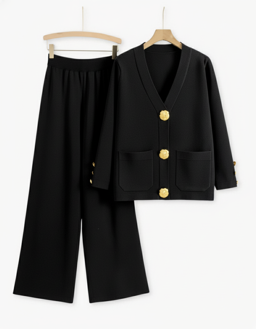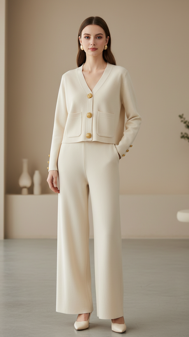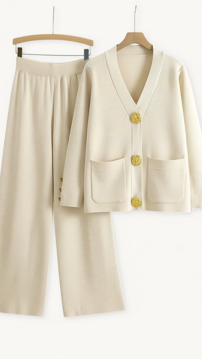 Díky neutrálním barvám a klasickému designu lze komplet snadno kombinovat s různými doplňky a nosit při mnoha příležitostech – do práce, na volnočasové aktivity i na večerní setkání. Vionza – Luxusní pletený komplet je univerzální kousek, který se přizpůsobí vašemu životnímu stylu a dodá vašemu šatníku sofistikovaný nádech.