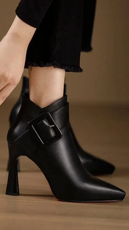 Dámské kožené kotníkové boty s přezkou a červenou podrážkou